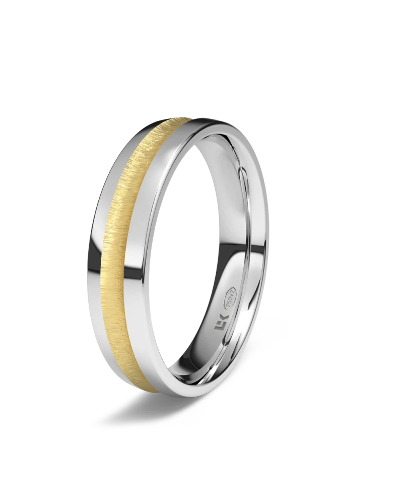 Tiene un ancho de 4,5 mm y un espesor de 1,4 mm por lo que es una alianza muy fuerte. Los laterales del anillo tienen un canto en oro blanco, mientras que la parte central es un surco de oro amarillo.