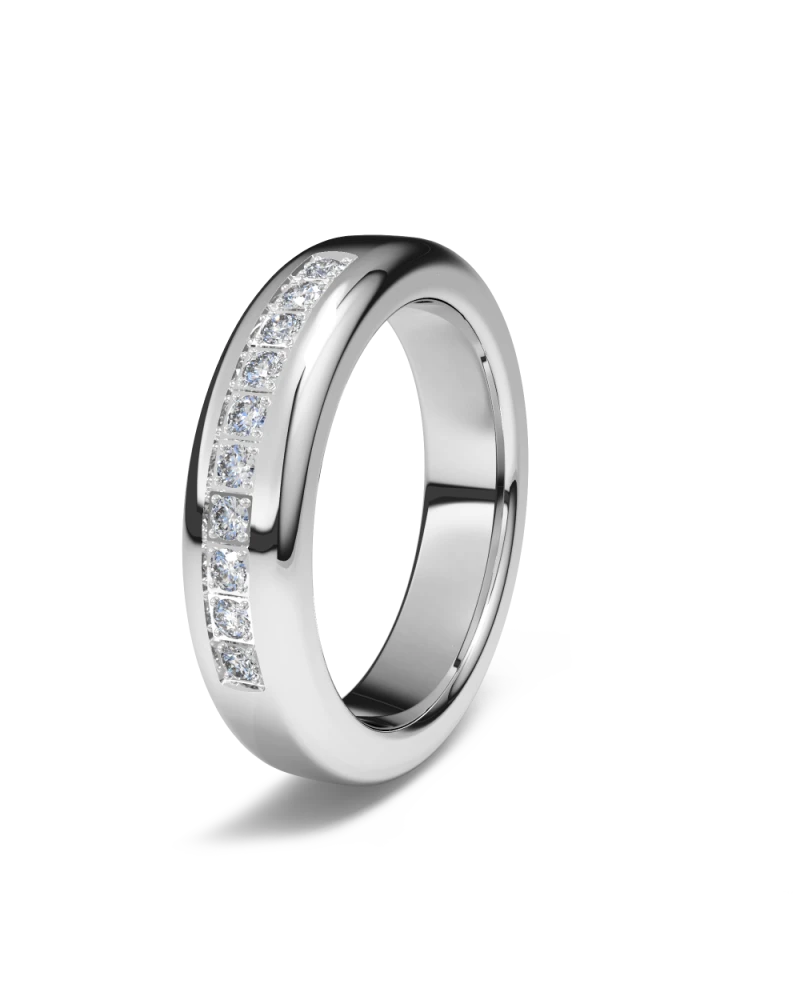Alianza de oro blanco de 18 k con diamantes. El anillo tiene un ancho de 4,5 mm y un espesor de 2 mm, por lo que es un anillo muy fuerte. Tiene 10 diamantes de un tamaño de 1,5 mm con una talla brillante, un color H y una calidad VS, engastados en pavé. Todo ello con un pulido a mano para sacarle el máximo brillo a la joya.