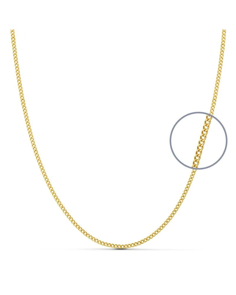 Cadena de oro de 18 kilates de 45 cm de largo (es una cadena corta). Tiene 1,2 mm de ancho. Incluye una marca de contraste oficial 750 y sello de fabricante. Se entrega con estuche y toda la garantía de la joyería más antigua de España.