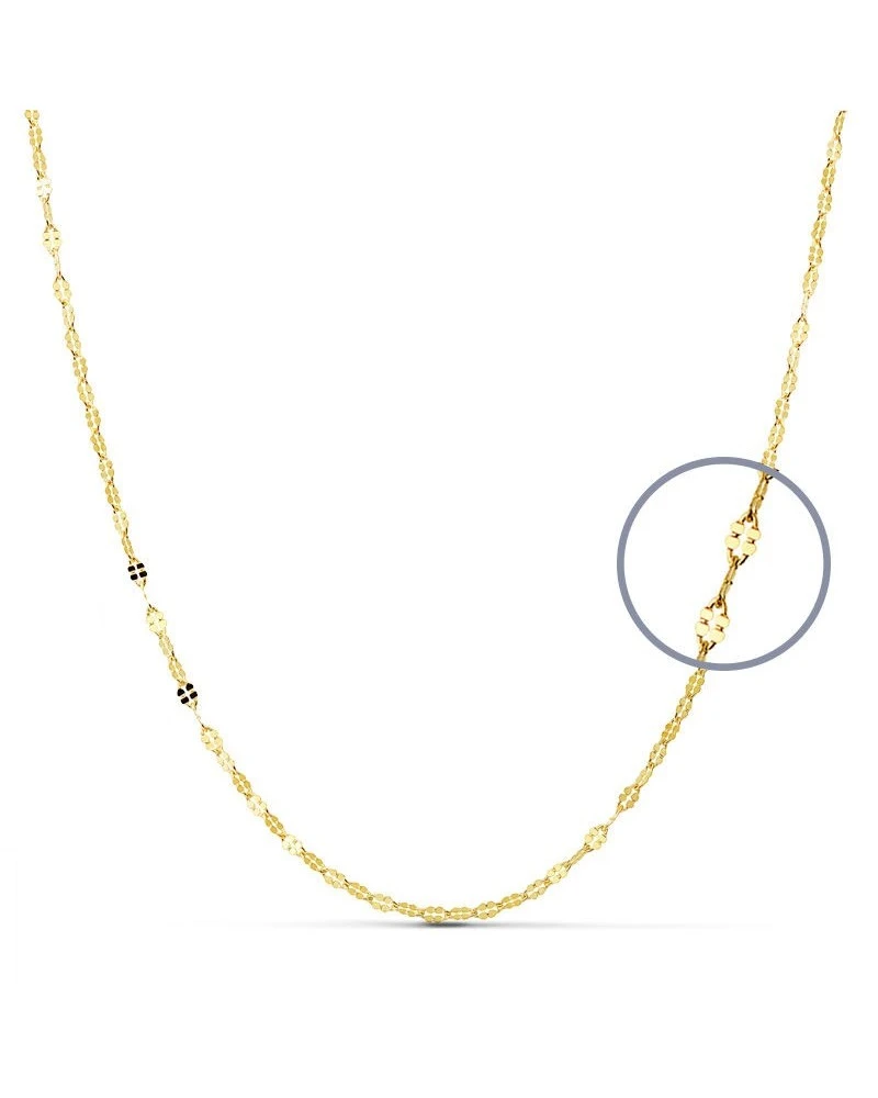 Cadena de oro de 18 kilates de 45 cm de largo con un diseño facetado. Tiene 2 mm de ancho. Incluye una marca de contraste oficial 750 y sello de fabricante. Se entrega con estuche y toda la garantía de la joyería más antigua de España.
