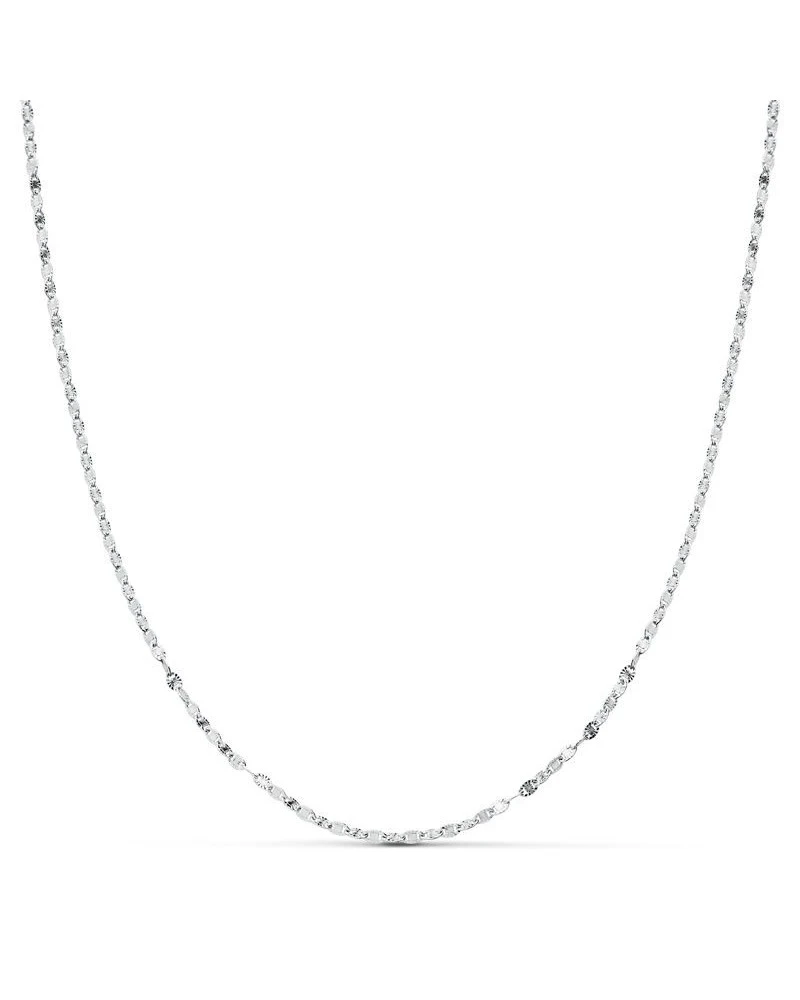 Cadena de oro blanco de 18 kilates con un largo de 45cm. Es una cadena con un efecto «diamante», eso quiere decir que el oro está tallado de tal manera que aumenta los reflejos con la luz para darle más brillo. Tiene un ancho de 1,5 mm. Incluye una marca de contraste oficial 750 y sello de fabricante. Se entrega con estuche y toda la garantía de la joyería más antigua de España.