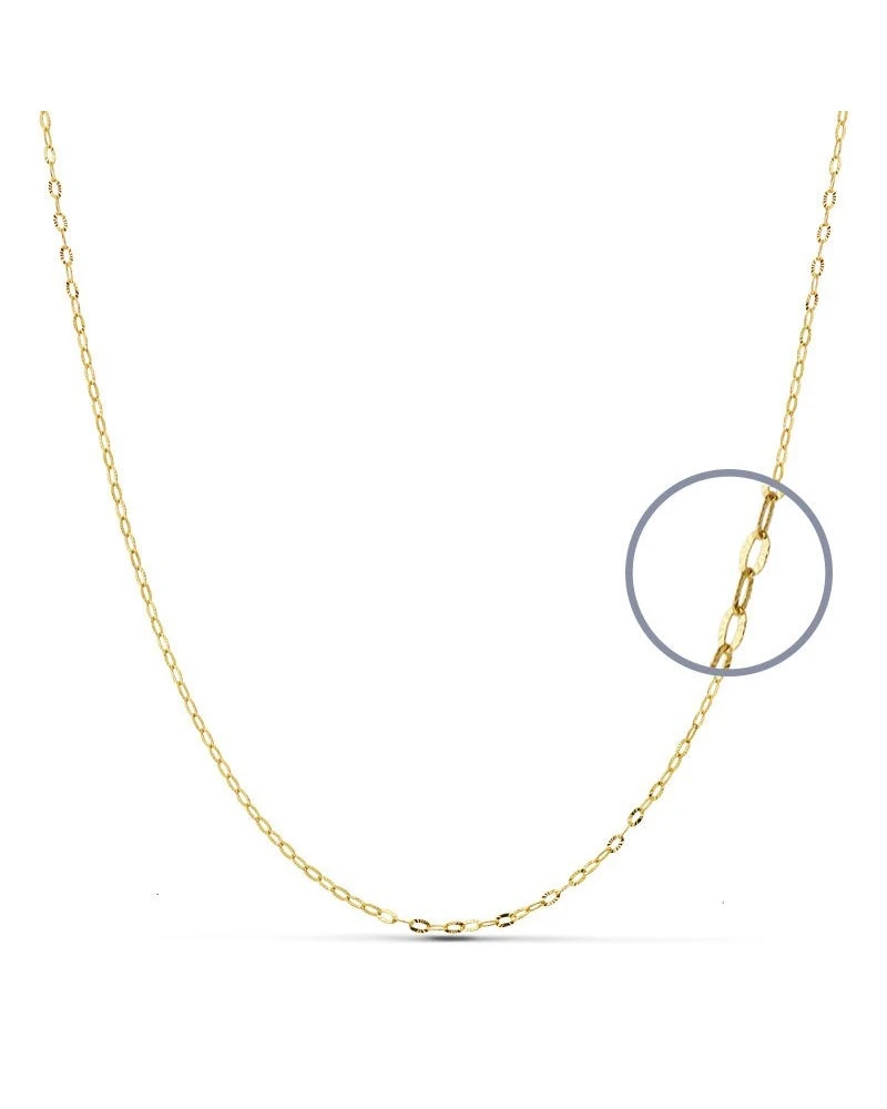 Cadena de oro de 18 kilates con un largo de 45 cm. Tiene un diseño conocido como «forzado», además la cadena está tallada para obtener un mayor brillo. Es una cadena muy fina. Incluye una marca de contraste oficial 750 y sello de fabricante. Se entrega con estuche y toda la garantía de la joyería más antigua de España.