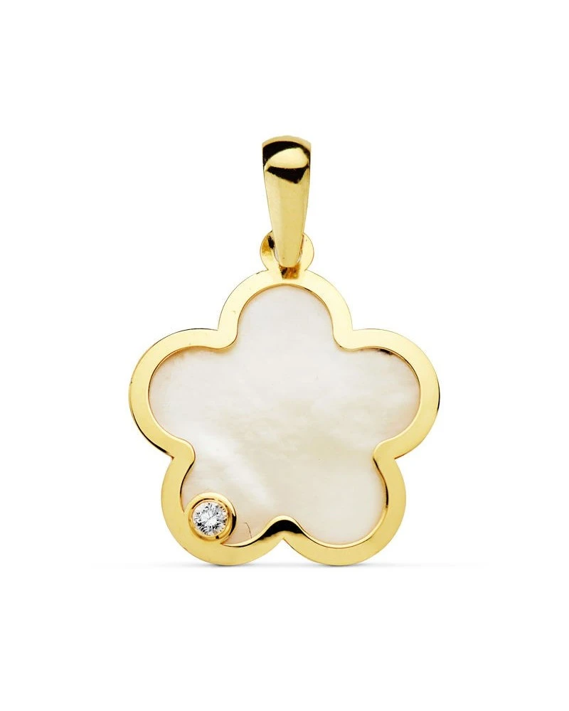 Colgante de oro de 18 kilates con un flor de nácar y circonitas y un tamaño de 17x17mm