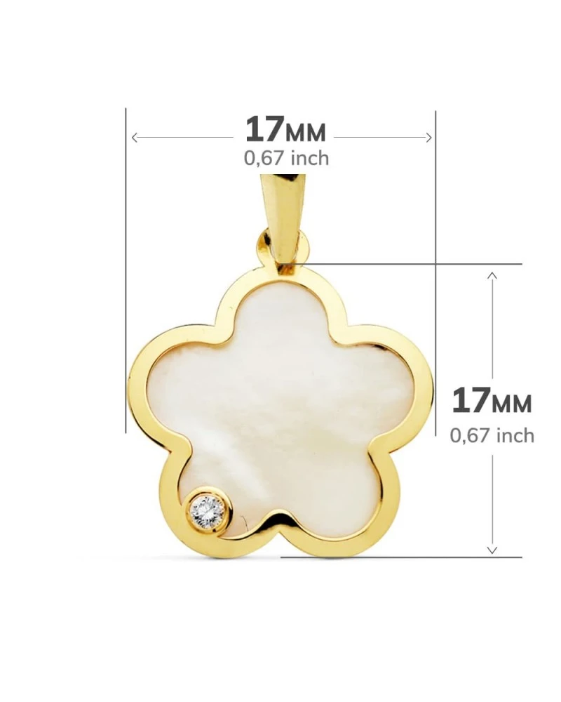 Colgante de oro de 18 kilates con un flor de nácar y circonitas y un tamaño de 17x17mm. Este colgante forma parte de la colección de oro de Falomir Joyas, y se entrega con estuche y marca de contraste oficial.
