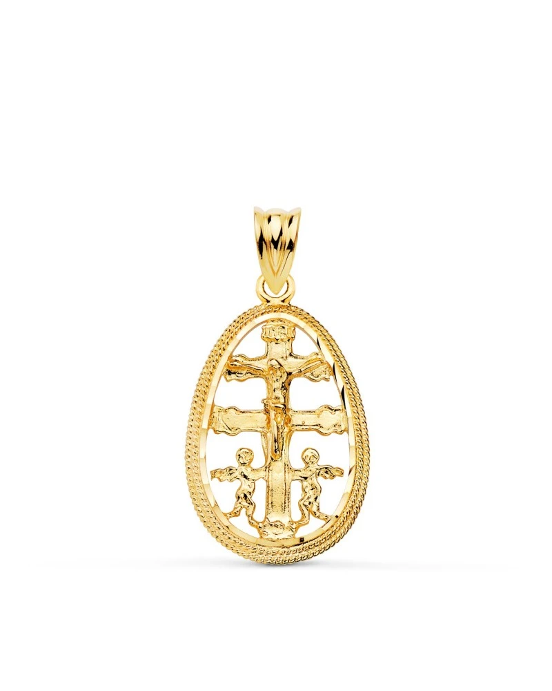 18K COLGANTE CRUZ DE CARAVACA ORO AMARILLO CERCO OVAL TALLADO. 23 X 16MM