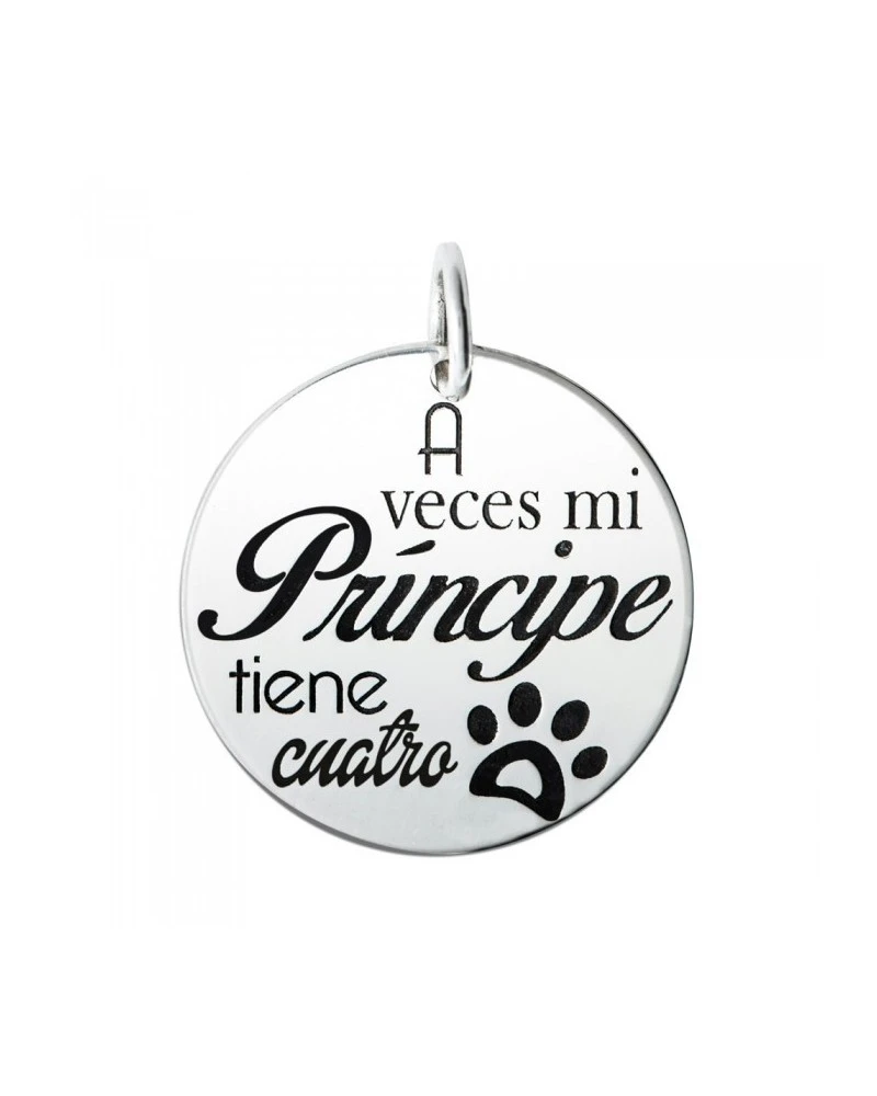 Colgante de plata de primera ley con el mensaje «A veces mi principe tiene cuatro» y una huella de perrito o gatito. Ideal para regalar a amantes de los animales y combinar con una cadena.