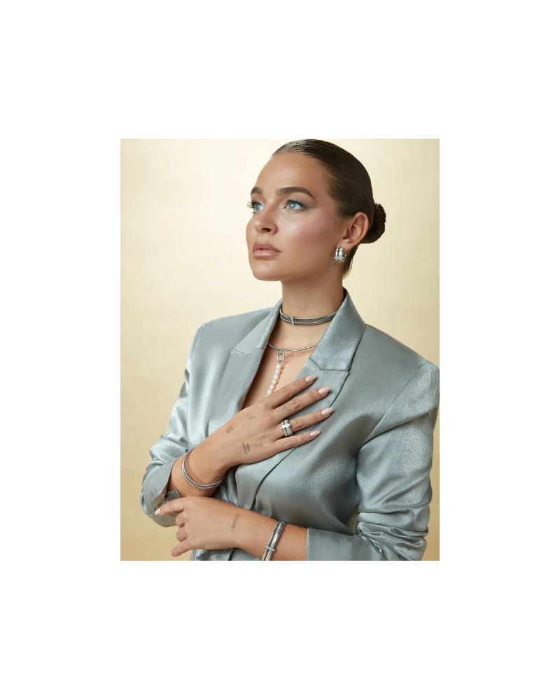 Su diseño contemporáneo lo convierte en un accesorio versátil, ideal para cualquier ocasión, ya sea una reunión formal o una salida casual. El acabado en acero le da un toque sofisticado y minimalista, que puede complementar cualquier estilo personal.
