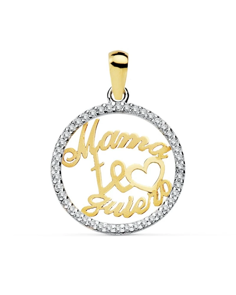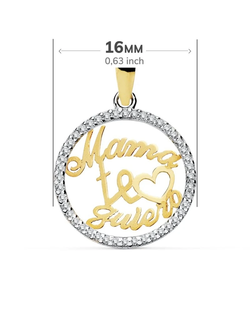 Colgante de oro de 18 kilates con «Mamá te quiero» y un corazón, todo ello rodeado por un bisel de cironitas de oro blanco de 16 mm.