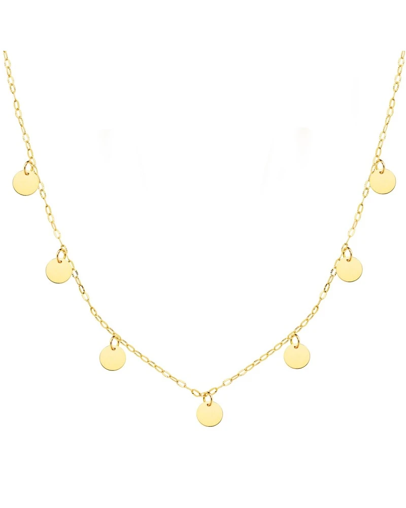 Collar de oro amarillo de 18 kilates corta con pequeñas chapas de unos 5 mm. Le acompaña una cadena conocida como «forzada». Este collar tiene un largo de 4cm. El collar forma parte de la colección de oro de Falomir Joyas, y se entrega con estuche y marca de contraste oficial.
