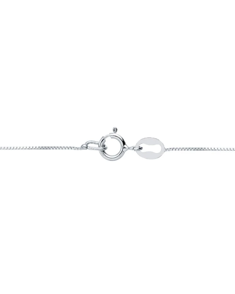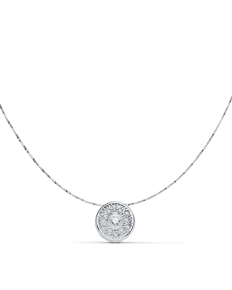 Collar de oro blanco de 18 kilates con con un colgante de unos 8 mm con circonitas. Este collar tiene un largo de 42cm. El collar forma parte de la colección de oro de Falomir Joyas, y se entrega con estuche y marca de contraste oficial.