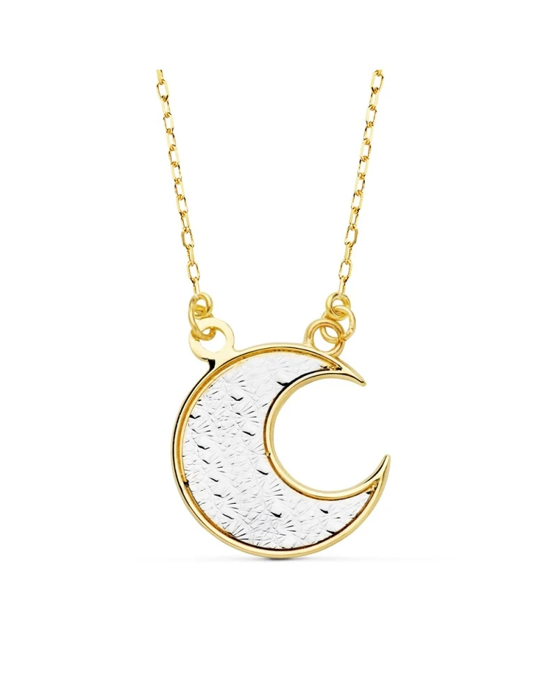 Collar de oro blanco y amarillo de 18 kilates con con una luna de unos 14×14 mm. cm. El collar forma parte de la colección de oro de Falomir Joyas, y se entrega con estuche y marca de contraste oficial.