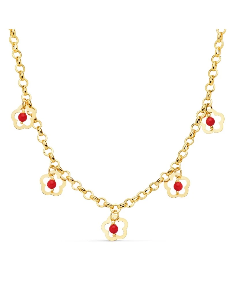 Collar de corales y oro de 18 kilates con pequeñas flores de unos 12 mm. Este collar tiene un largo de 45cm. El collar forma parte de la colección de oro de Falomir Joyas, y se entrega con estuche y marca de contraste oficial.