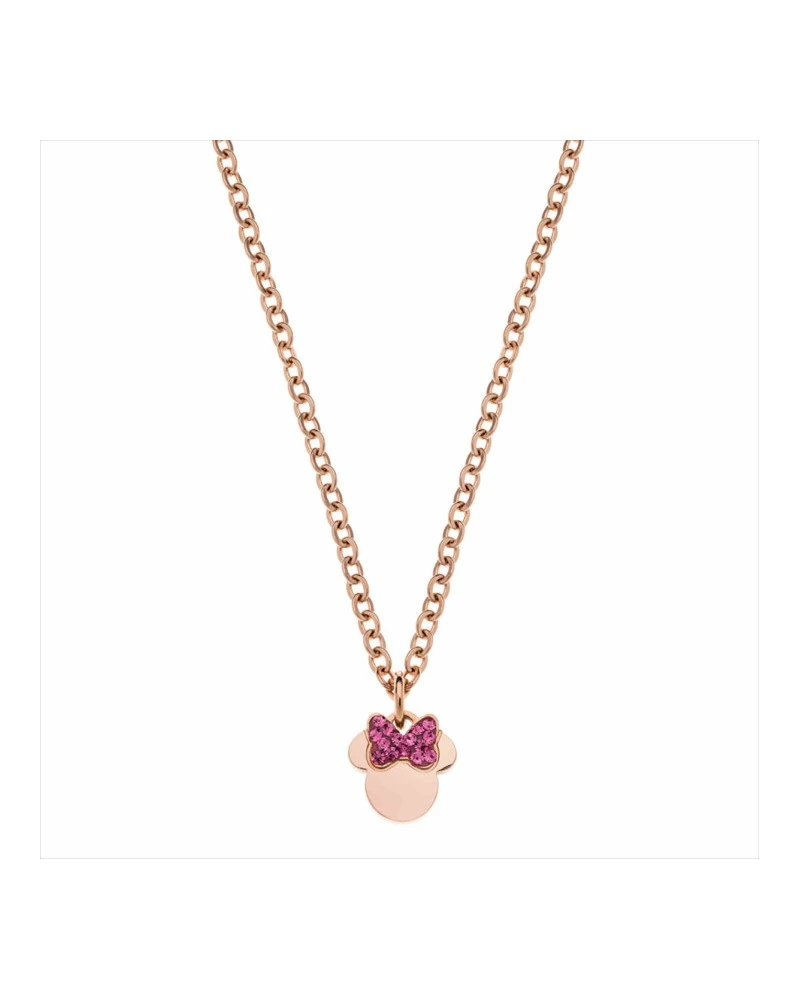 Collar de acero con baño de oro rosa de la marca Disney. Su largo de 35 centímetros se puede extender hasta 40 cm gracias a las asas ajustables. El diseño del lazo de Minnie Mouse está decorado con circonitas rosas. Se entrega con certificado de autenticidad, además de venir presentado en bolsa y estuche oficial de la marca, garantizando su originalidad.
