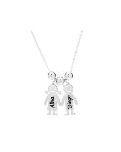 Colgantito con forma de un niño y una niña tallado en plata de primera ley cadena incluida. En la parte central se puede grabar en nombre de cada uno de los colgantes. Es un regalo ideal para las mamás, para celebrar un nacimiento, un cumpleaños o por alguna fecha señalada. El colgante se entrega con una cadena de plata. Se entrega con estuche y preparado para regalo si queréis, sin ningún coste adicional. Como todos los productos personalizados, tiene un tiempo envío de 15 días.
