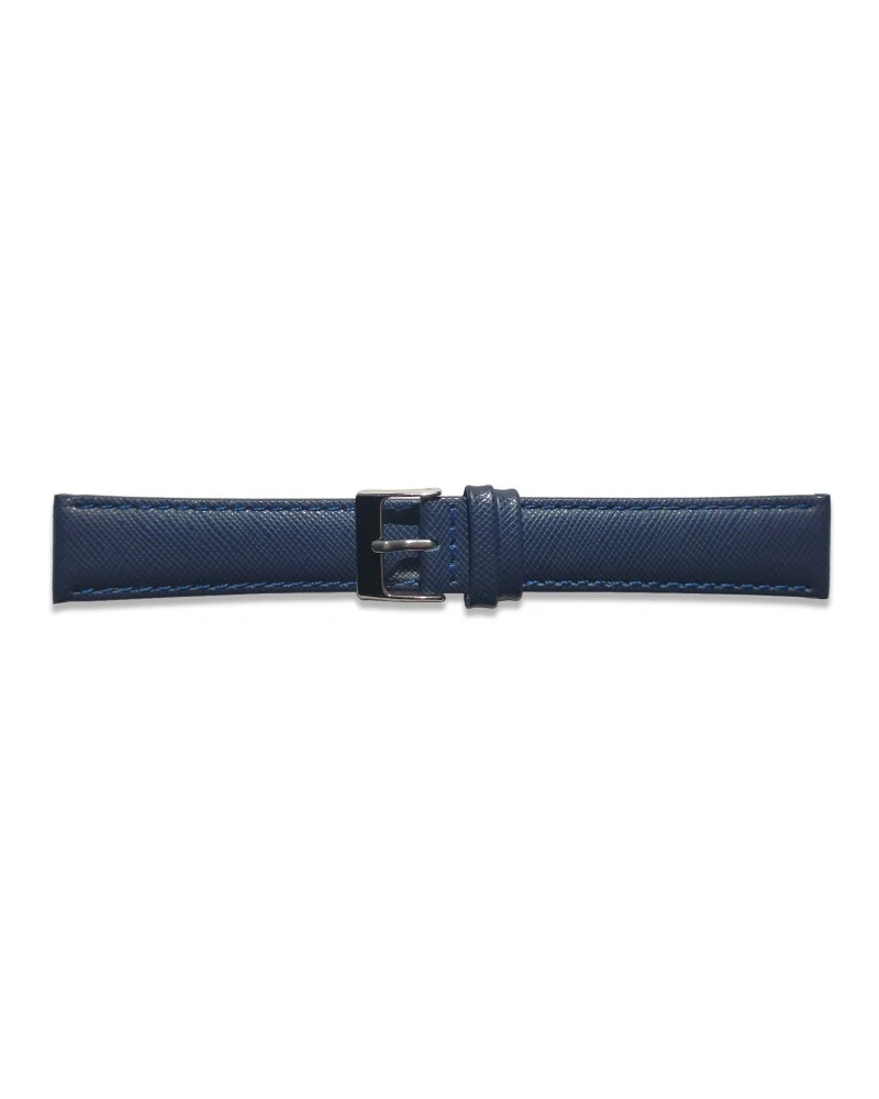 Así es esta correa de piel de 20 milímetros y, acabada en azul oscuro. Con pespunte del mismo color