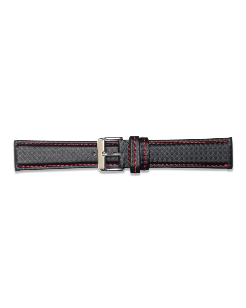 Así es esta correa de piel de 20 milímetros y, acabado en negro, con pespunte del color rojo.