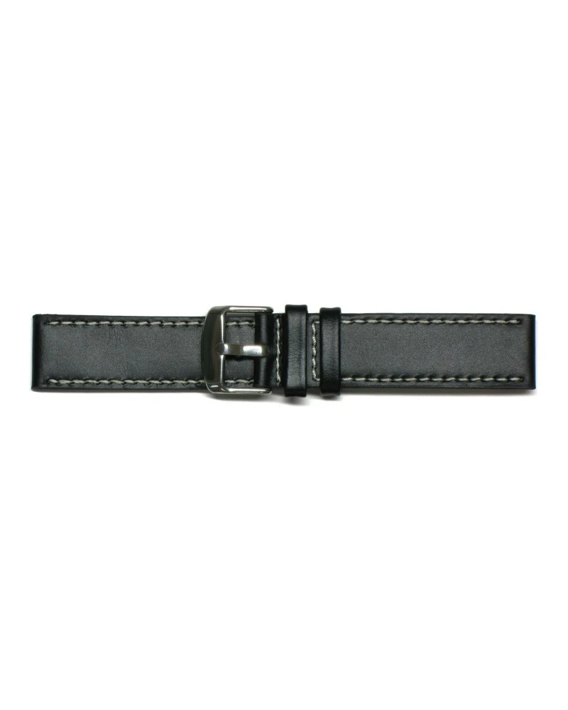 Así es esta correa de piel de 24 milímetros y, acabada en negro, Con pespunte blanco.