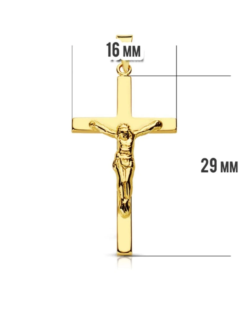 Cruz de oro de 18 kilates con un cristo y un tamaño de 31x16mm. Las cruces forman parte de la colección de oro de Falomir Joyas, y se entregan con estuche y marca de contraste oficial.