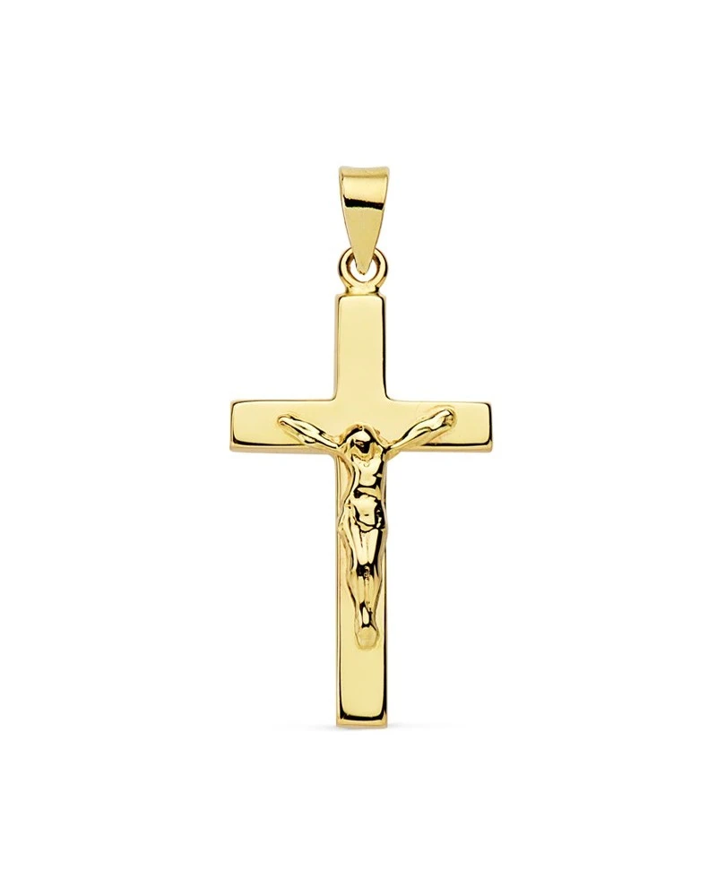 Cruz de oro de 18 kilates con un cristo y un tamaño de 23x12mm. Las cruces forman parte de la colección de oro de Falomir Joyas, y se entregan con estuche y marca de contraste oficial.