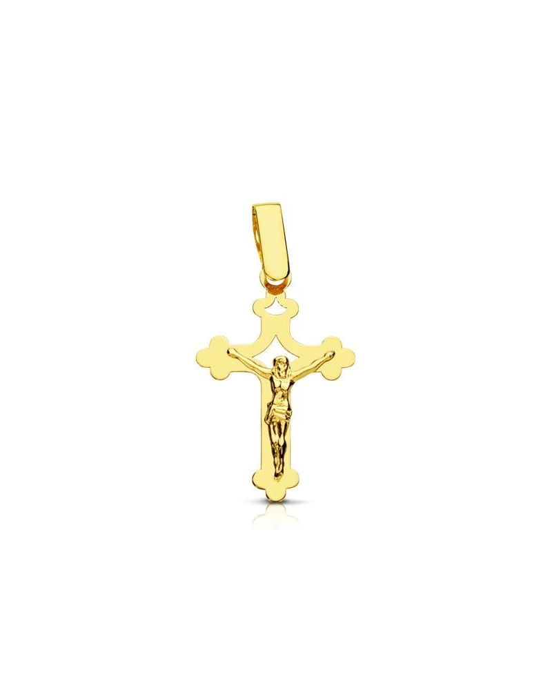 Cruz de oro de 18 kilates con un cristo y un tamaño de 22x14mm. Las cruces forman parte de la colección de oro de Falomir Joyas, y se entregan con estuche y marca de contraste oficial.