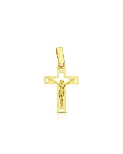 Cruz de oro de 18 kilates con un cristo y un tamaño de 22x14mm. Las cruces forman parte de la colección de oro de Falomir Joyas, y se entregan con estuche y marca de contraste oficial.