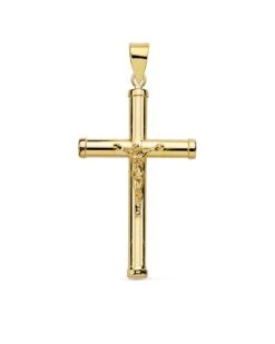 Cruz de oro de 18 kilates con un cristo y un tamaño de 32 X 19x3mm. Las cruces forman parte de la colección de oro de Falomir Joyas, y se entregan con estuche y marca de contraste oficial.