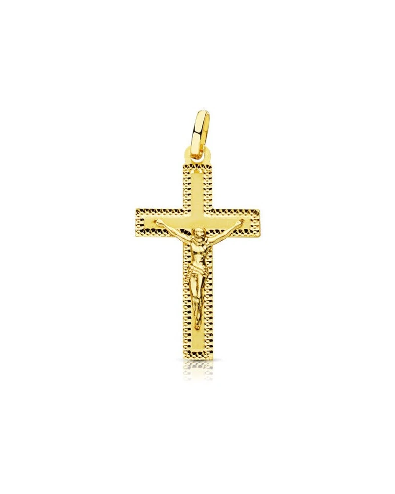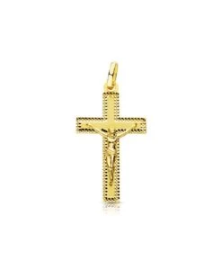 Cruz de oro de 18 kilates con un cristo y un tamaño de 27x15mm. Las cruces forman parte de la colección de oro de Falomir Joyas, y se entregan con estuche y marca de contraste oficial.