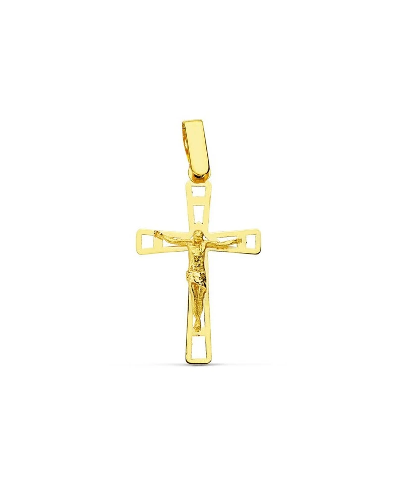 Cruz de oro de 18 kilates con un cristo y un tamaño de 26x16mm. Las cruces forman parte de la colección de oro de Falomir Joyas, y se entregan con estuche y marca de contraste oficial.