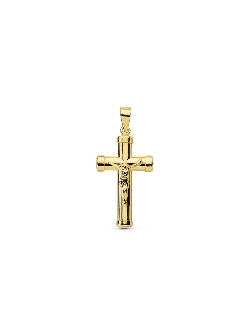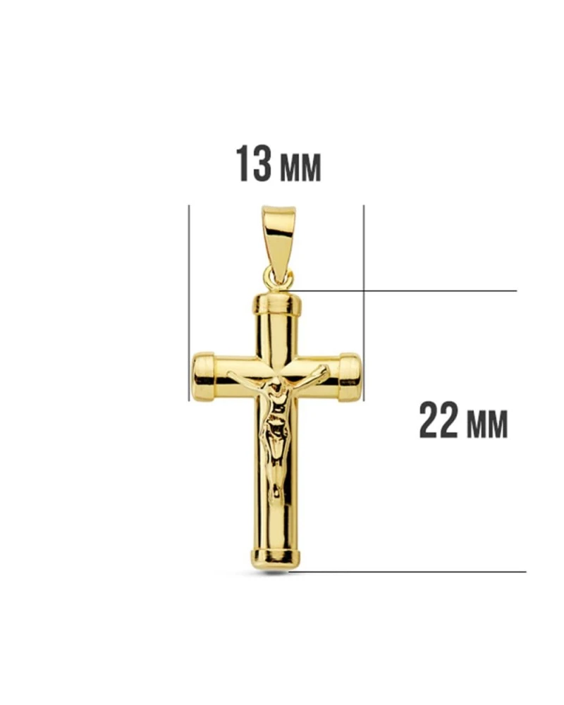 Cruz de oro de 18 kilates con un cristo y un tamaño de 24x13mm. Las cruces forman parte de la colección de oro de Falomir Joyas, y se entregan con estuche y marca de contraste oficial.