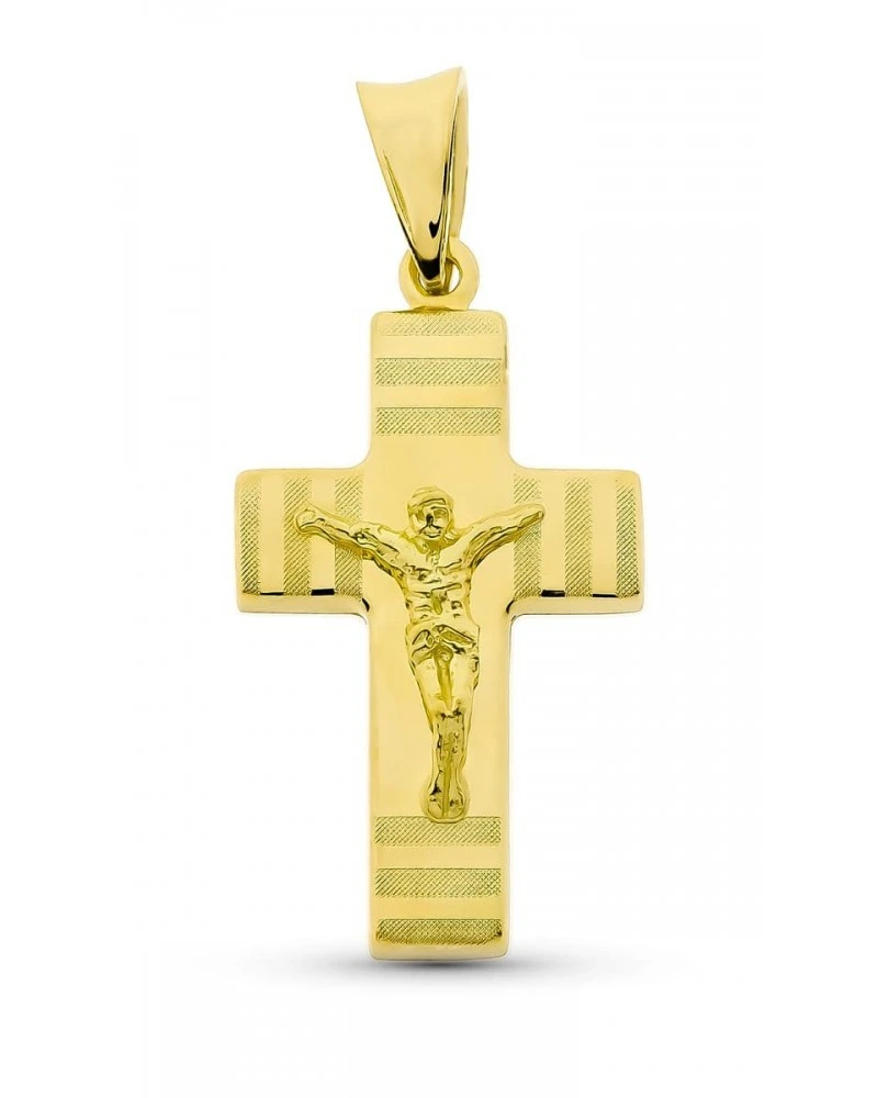 18K CRUZ ORO AMARILLO HUECA CON CRISTO MATE Y BRILLO 27X15 MM