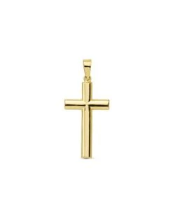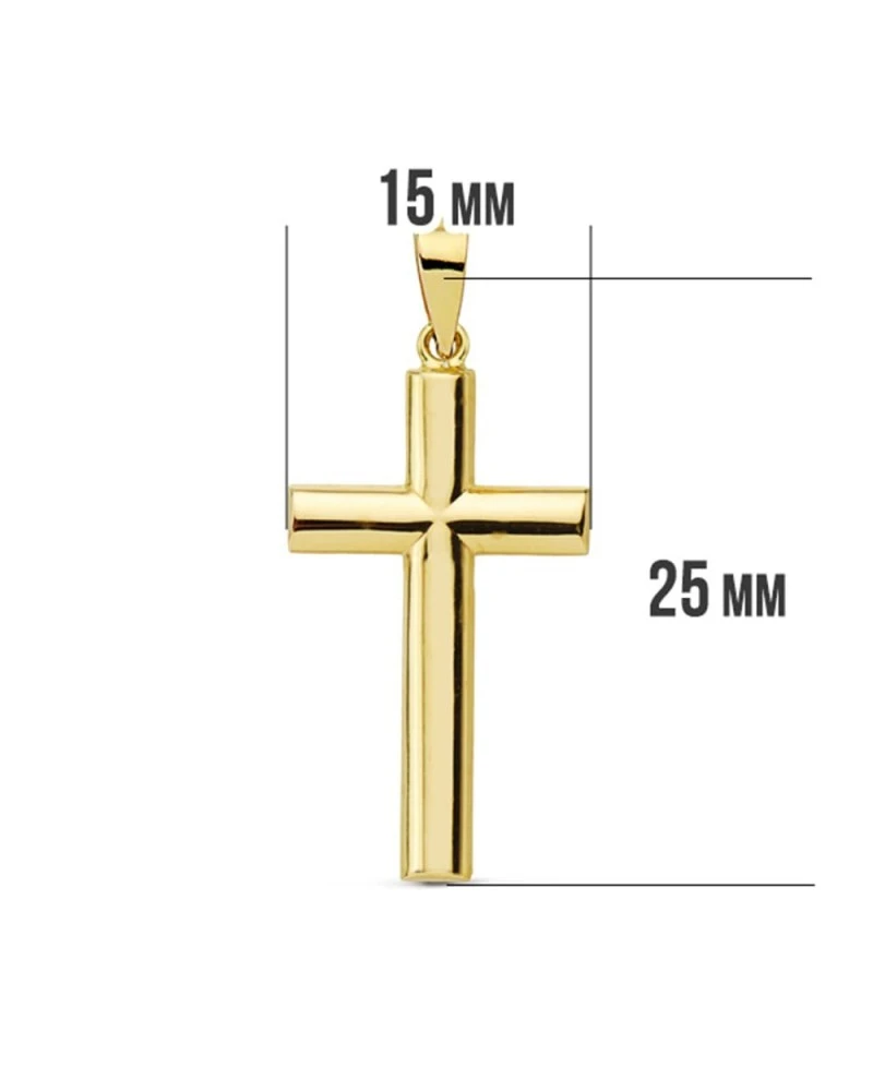 Cruz de oro de 18 kilates lisa y un tamaño de 25x15mm. Las cruces forman parte de la colección de oro de Falomir Joyas, y se entregan con estuche y marca de contraste oficial.