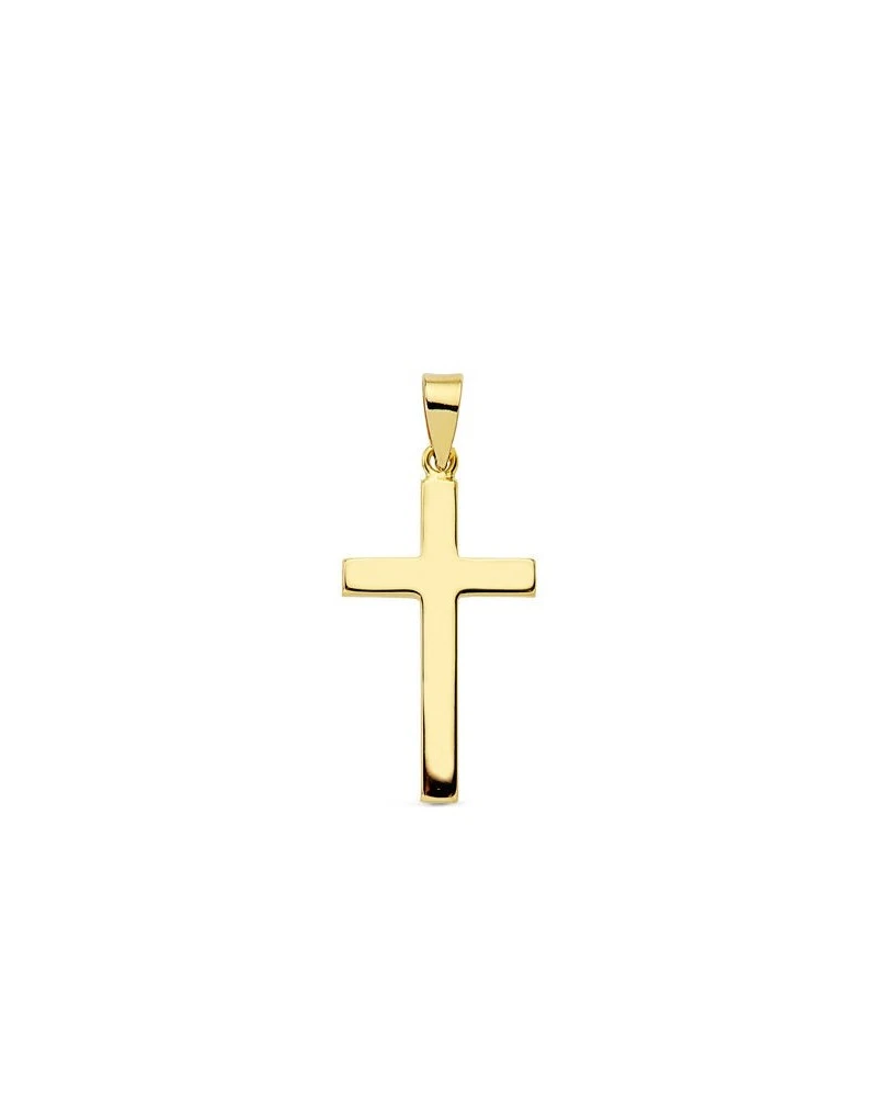 Cruz de oro de 18 kilates rectangular y un tamaño de 23x12mm. Las cruces forman parte de la colección de oro de Falomir Joyas, y se entregan con estuche y marca de contraste oficial.