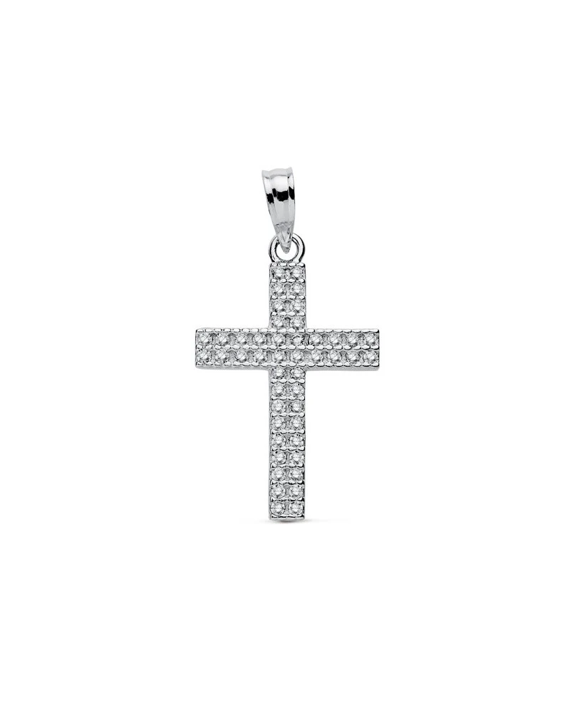 Cruz de oro de 18 kilates con circonitas y un tamaño de 24x15mm. Las cruces forman parte de la colección de oro de Falomir Joyas, y se entregan con estuche y marca de contraste oficial.