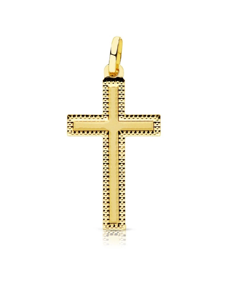 Cruz de oro de 18 kilates tallada y un tamaño de 27x15mm. Las cruces forman parte de la colección de oro de Falomir Joyas, y se entregan con estuche y marca de contraste oficial.