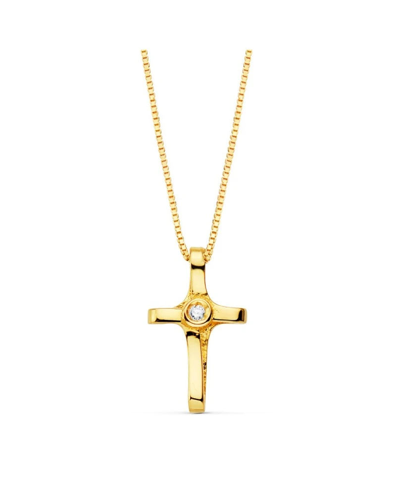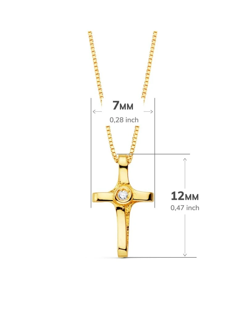Collar de oro de 18 kilates con un diamante con una talla brillante total de 0,010kilatesy un tamaño de 45cm. Las cruces forman parte de la colección de oro de Falomir Joyas, y se entregan con estuche y marca de contraste oficial.