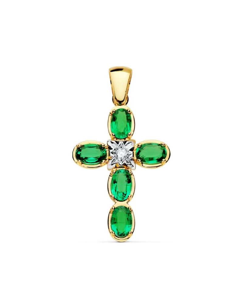 Cruz de oro de 18 kilates con diamantes con una talla brillante total de 0,045kilatesy un tamaño de 28x19mm. Las cruces forman parte de la colección de oro de Falomir Joyas, y se entregan con estuche y marca de contraste oficial.