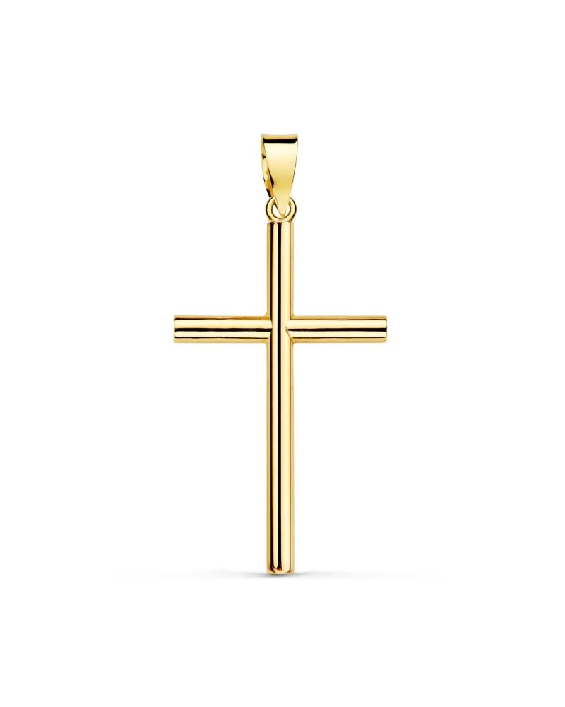 Cruz enioro de 18 kilates con el palo liso y hueco y un tamaño de 26x15mm. Incluyeimarca de contraste 750, sello oficial y se entregan con estuche de la marca Falomir.