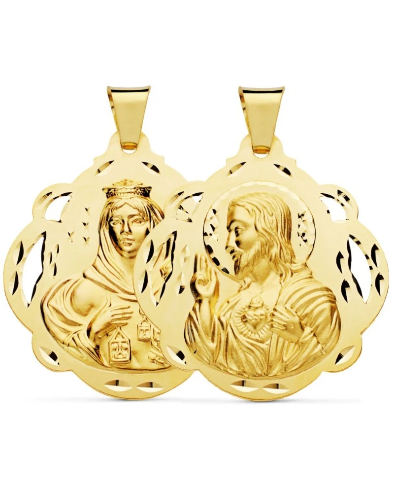 Escapulario de Oro de 18k Virgen del Carmen con un tamaño de 42 mm. Este escapulario forma parte de la colección de oro de Falomir Joyas, y se entrega con estuche y marca de contraste oficial.