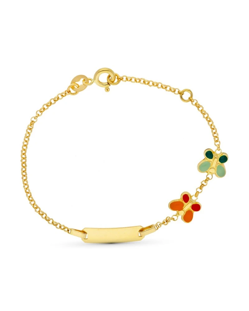 Esclava con mariposa de esmalte. Tiene un largo de 16 cm. Este sello forma parte de la colección de oro de Falomir Joyas, y se entrega con estuche y marca de contraste oficial.