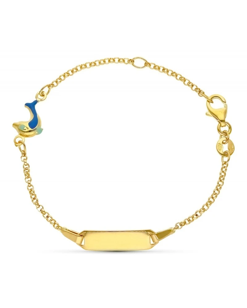 Esclava de oro amarillo con delfin de esmalte, con un largo de 16 cm. Este sello forma parte de la colección de oro de Falomir Joyas, y se entrega con estuche y marca de contraste oficial.