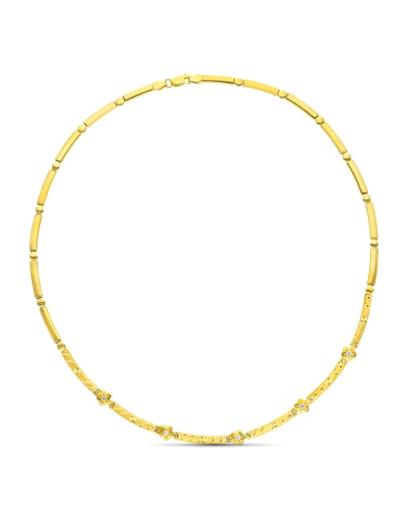 Gargantilla de oro amarillo de 18 kilates con un diseño moderno de tramos tallados y circonita. La gargantilla forma parte de la colección de oro de Falomir Joyas, y se entrega con estuche y marca de contraste oficial.