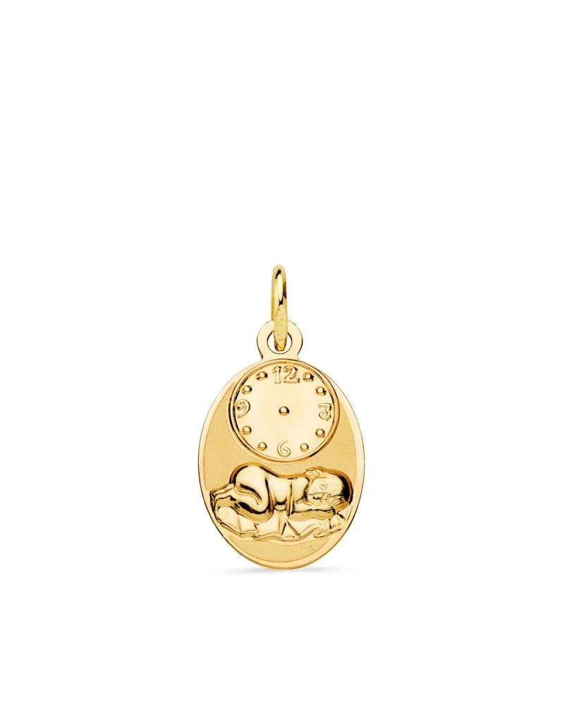 Medalla beb de oro de 18k con un tamao de 19 x 12 mm.