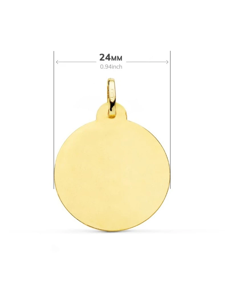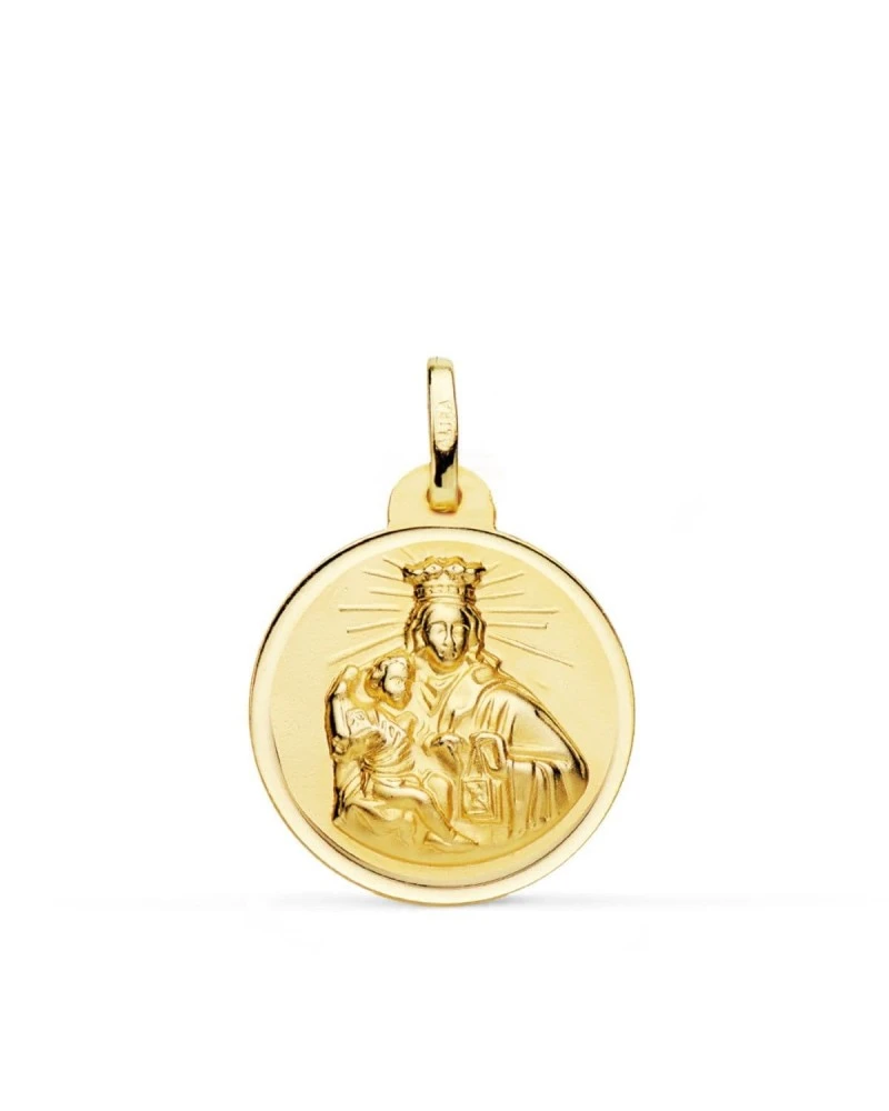 Medalla de Oro de 18k Maria del Carmen con un tamaño de 24 mm. Esta medalla forma parte de la colección de oro de Falomir Joyas, y se entrega con estuche y marca de contraste oficial.