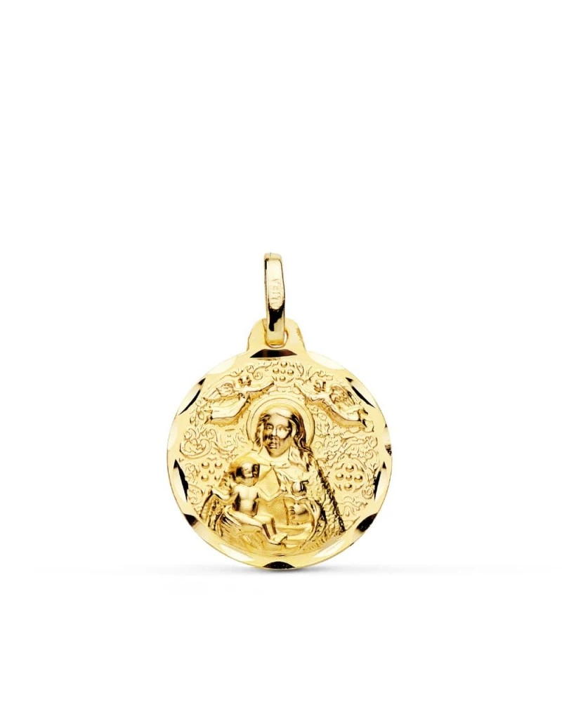 Medalla de Oro de 18k Virgen de la Cinta con un tamaño de 18 mm. Esta medalla forma parte de la colección de oro de Falomir Joyas, y se entrega con estuche y marca de contraste oficial.