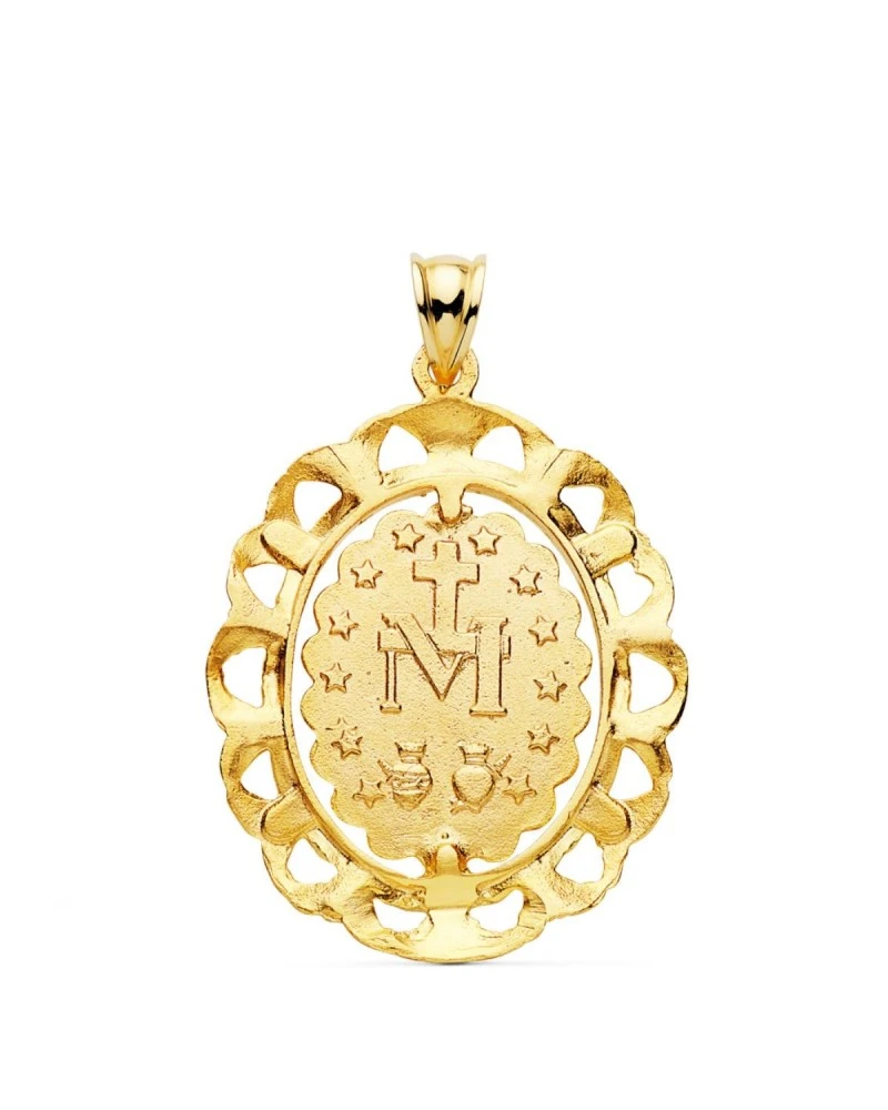 Medalla de Oro de 18k Virgen de la Milagrosa con un tamaño de 30 x 25 mm. Esta medalla forma parte de la colección de oro de Falomir Joyas, y se entrega con estuche y marca de contraste oficial.