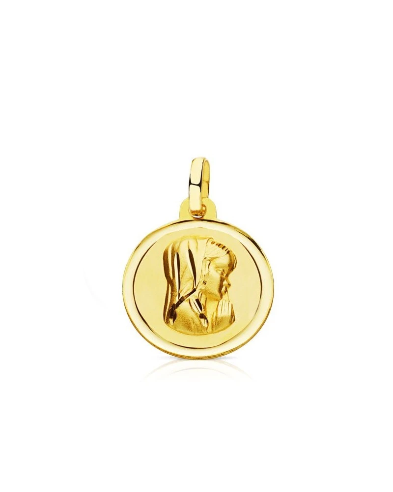 Medalla de oro de 18 kilates con una virgen niña y un tamaño de 16mm. Esta medalla forma parte de la colección de oro de Falomir Joyas, y se entrega con estuche y marca de contraste oficial.