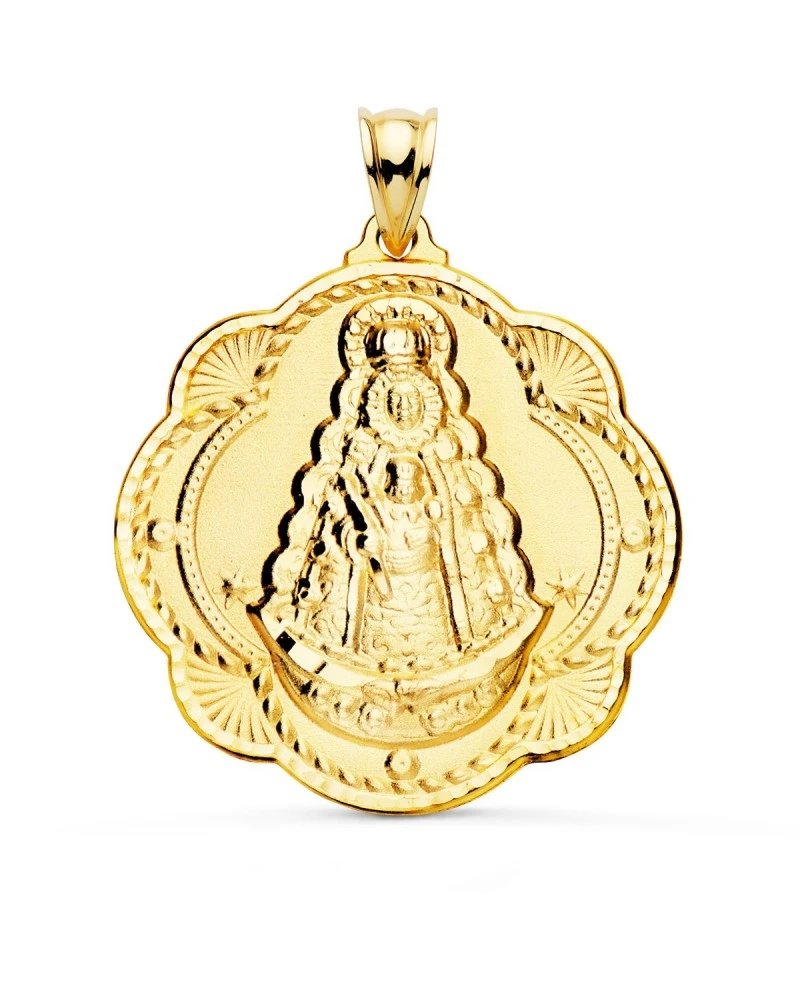 Medalla de oro de 18 kilates con la virgen del Rocio y un tamaño de 38x34mm. Esta medalla forma parte de la colección de oro de Falomir Joyas, y se entrega con estuche y marca de contraste oficial.