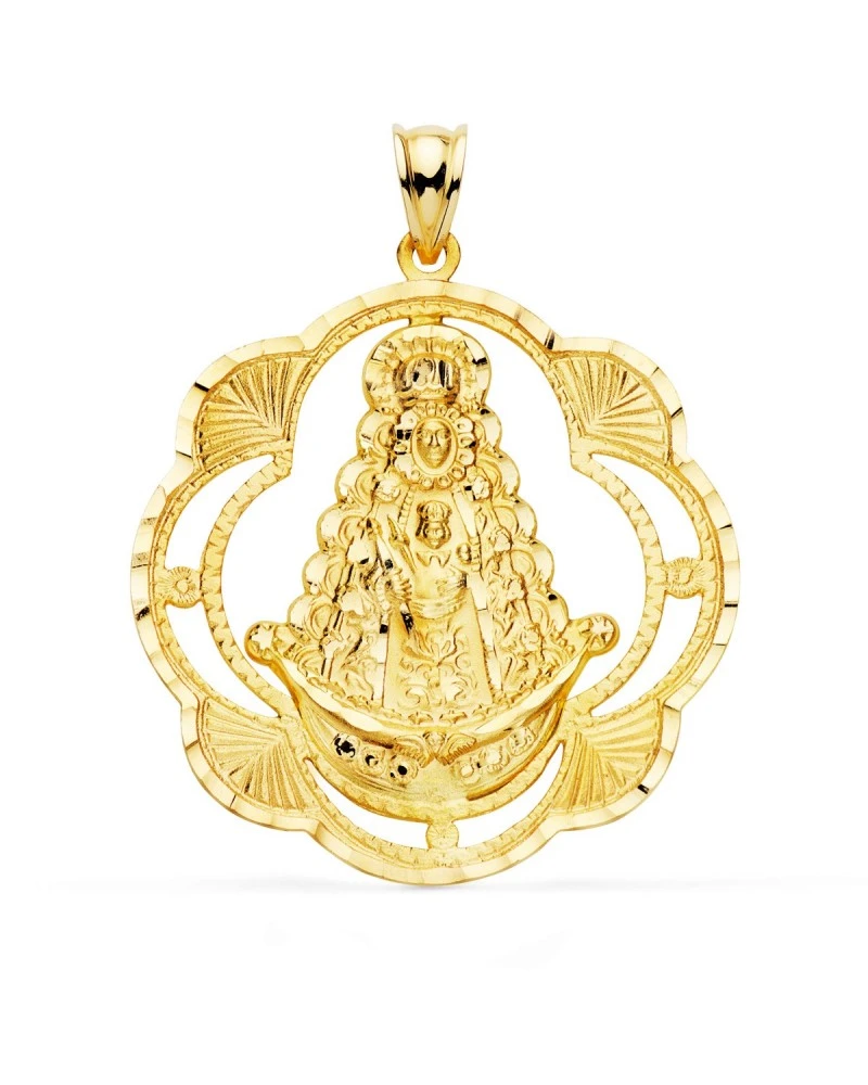 Medalla de oro de 18 kilates con la virgen del Rocio y un tamaño de 38x34mm. Esta medalla forma parte de la colección de oro de Falomir Joyas, y se entrega con estuche y marca de contraste oficial.