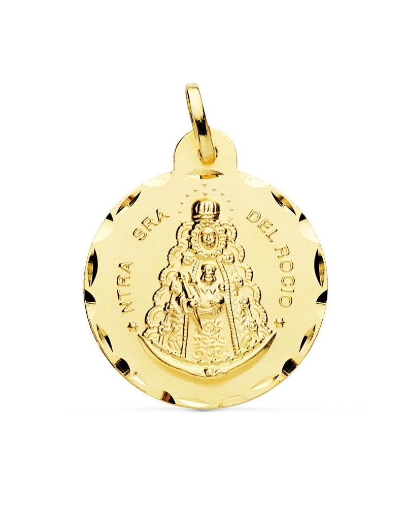 Medalla de oro de 18 kilates con la virgen del Rocio y un tamaño de 24mm. Esta medalla forma parte de la colección de oro de Falomir Joyas, y se entrega con estuche y marca de contraste oficial.