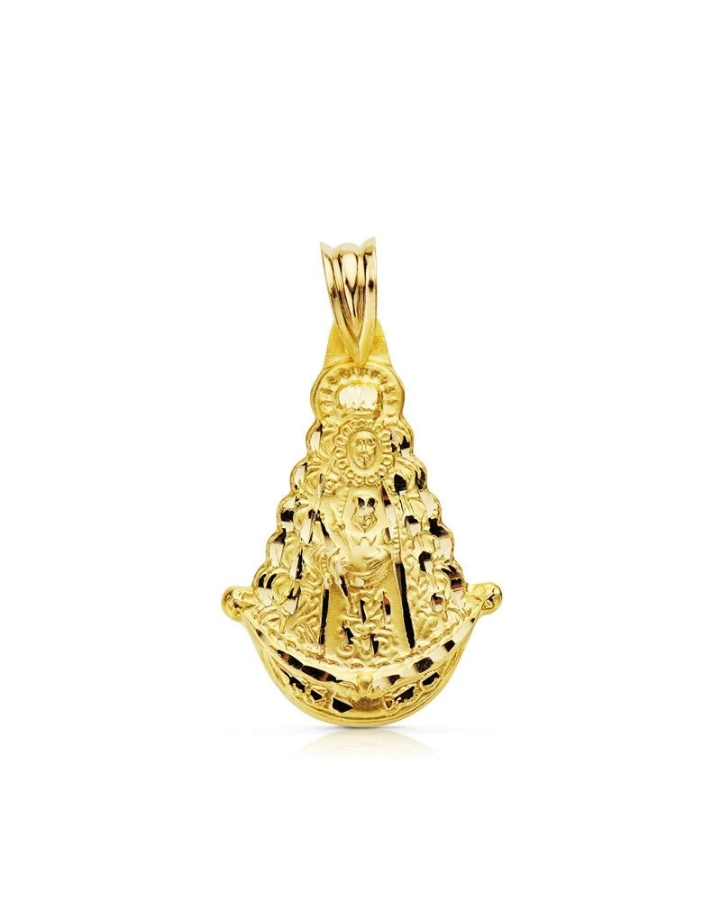Medalla de oro de 18 kilates con la virgen del Rocio y un tamaño de 30x20mm. Esta medalla forma parte de la colección de oro de Falomir Joyas, y se entrega con estuche y marca de contraste oficial.